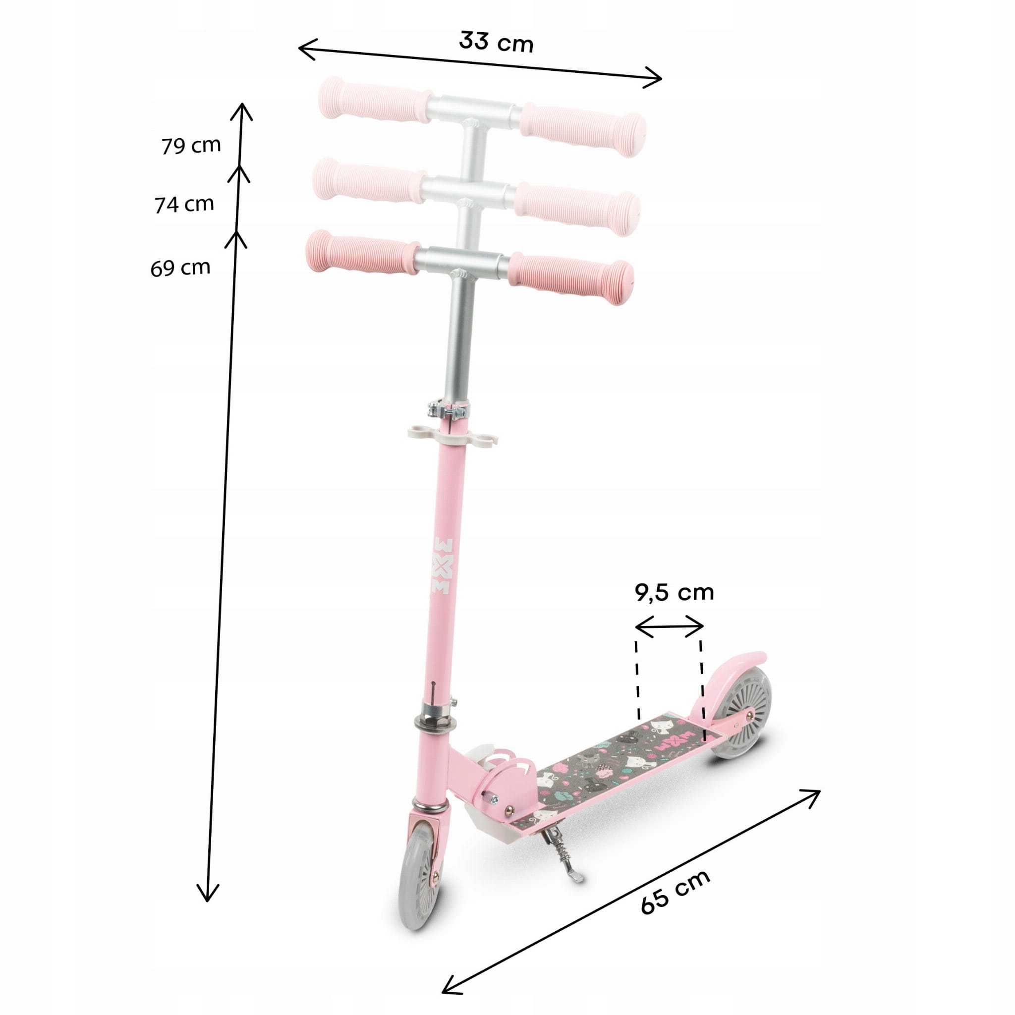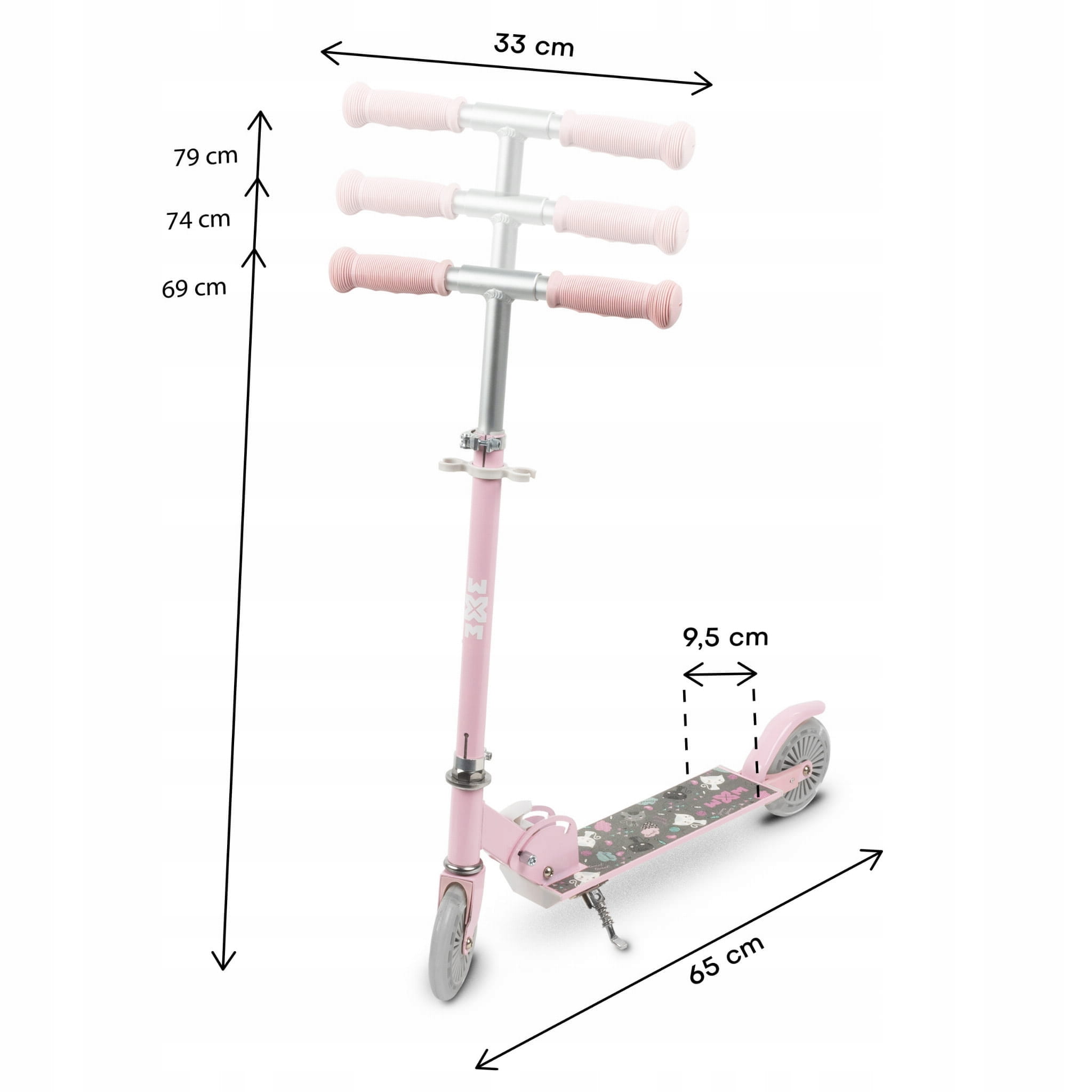 - Materiały: Podest, kierownica: Aluminium; Koła: PU