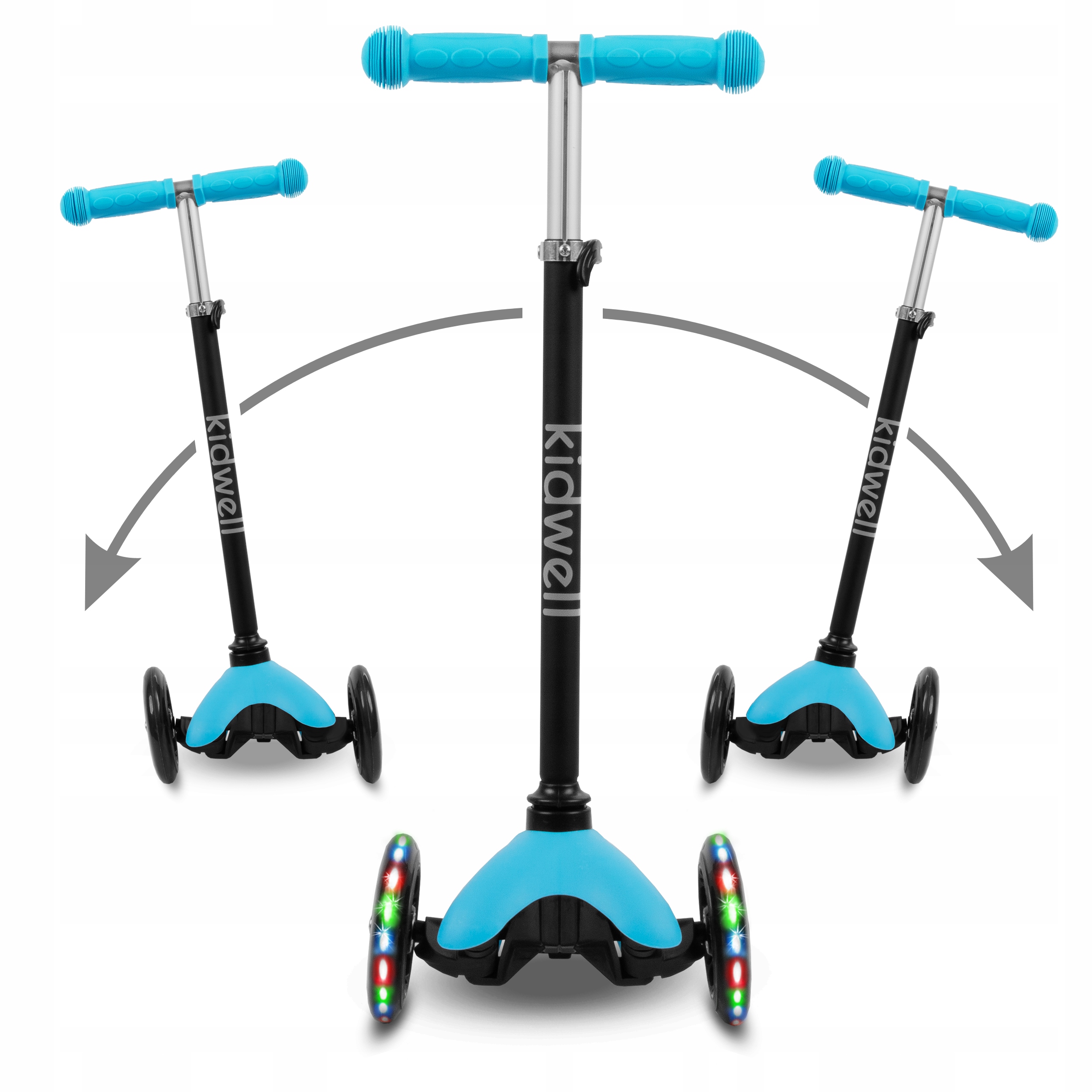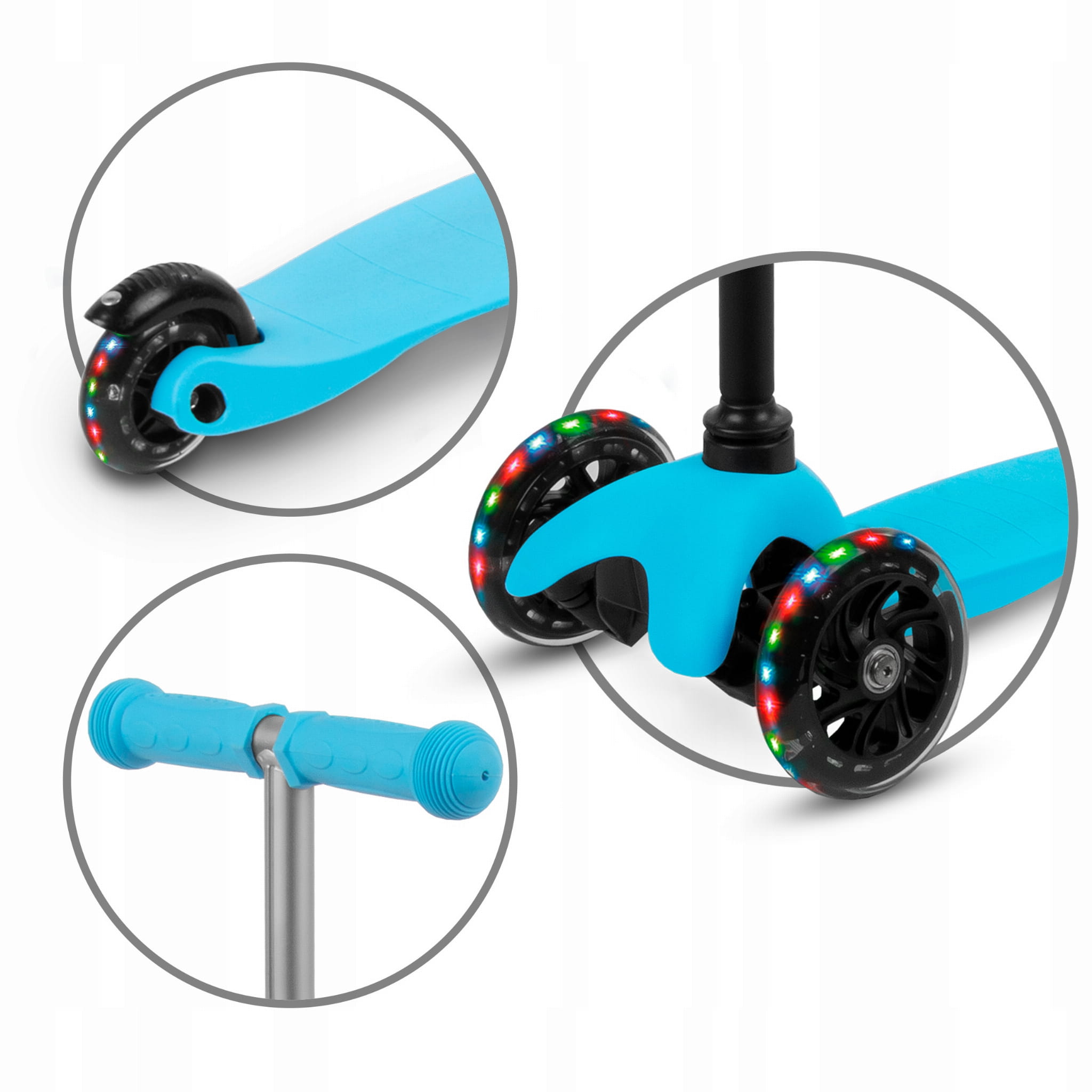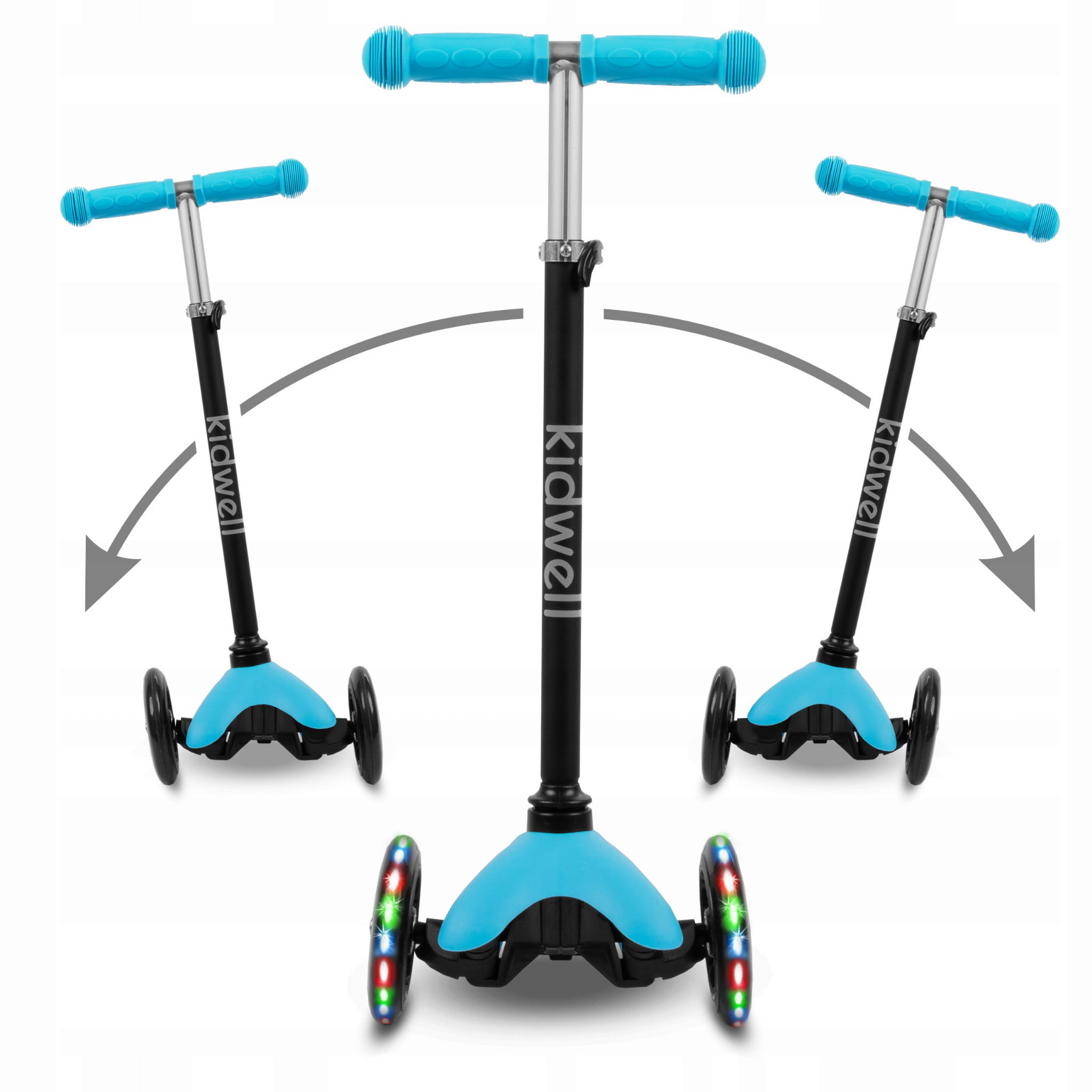 - Materiały: Aluminiowa kierownica, plastikowy podest, poliuretanowe koła z diodami LED