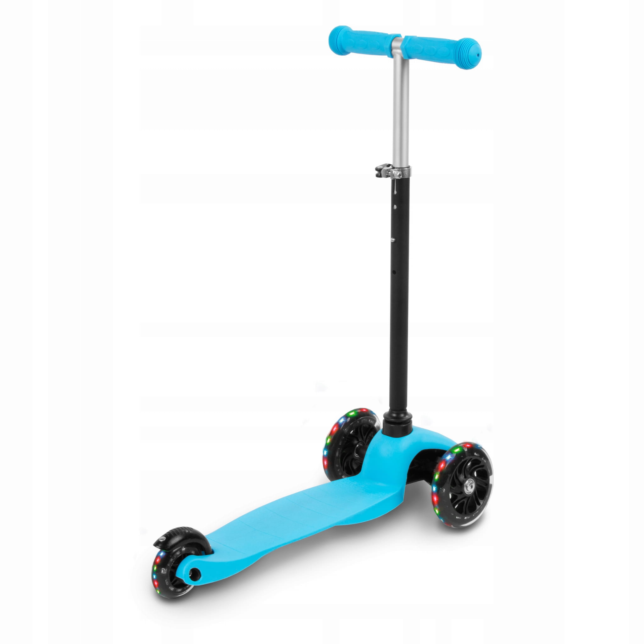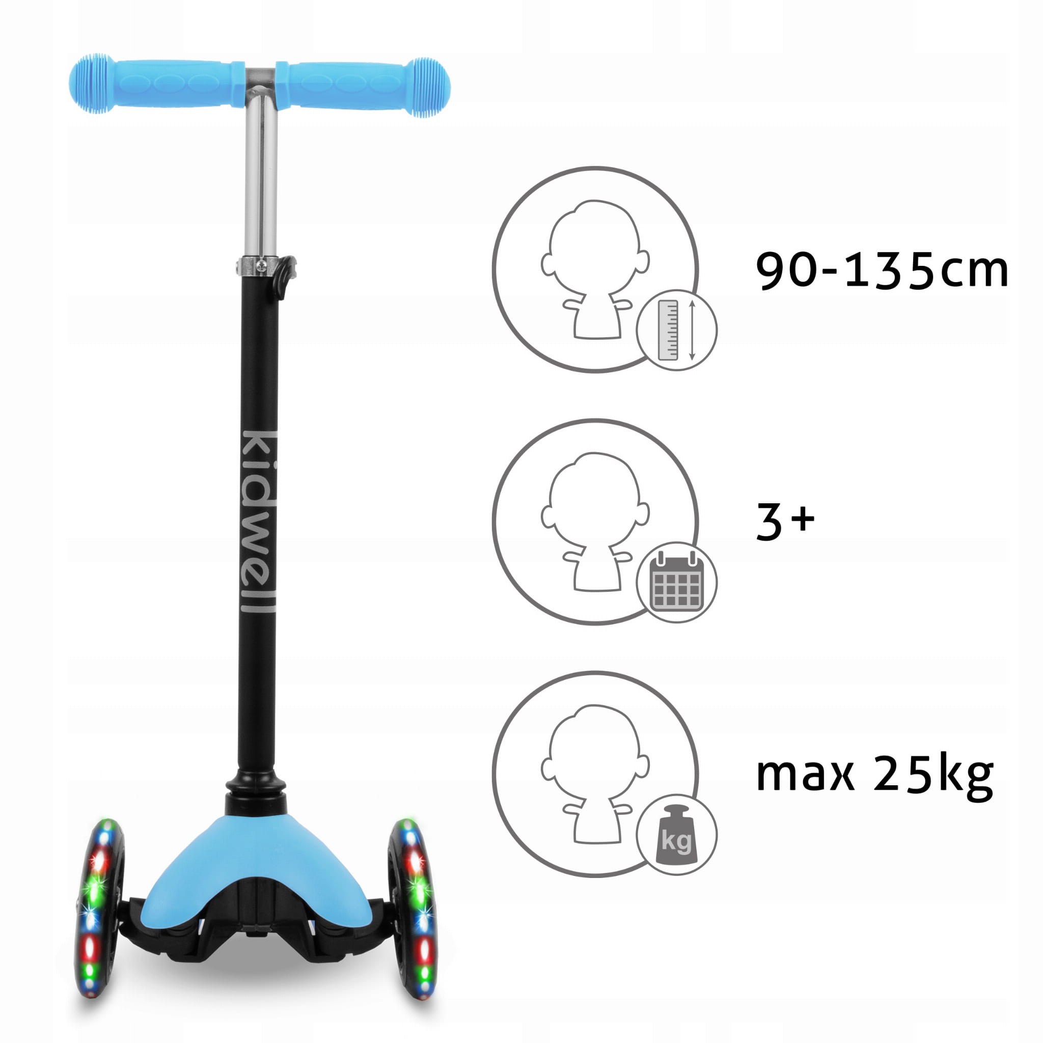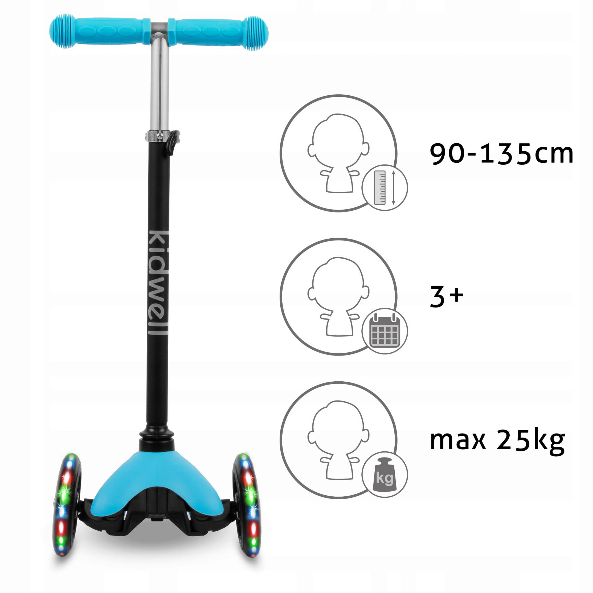 - Materiały: Aluminiowa kierownica, plastikowy podest, poliuretanowe koła z diodami LED
