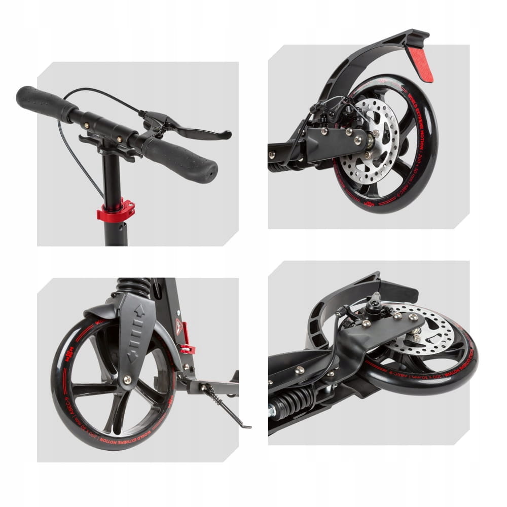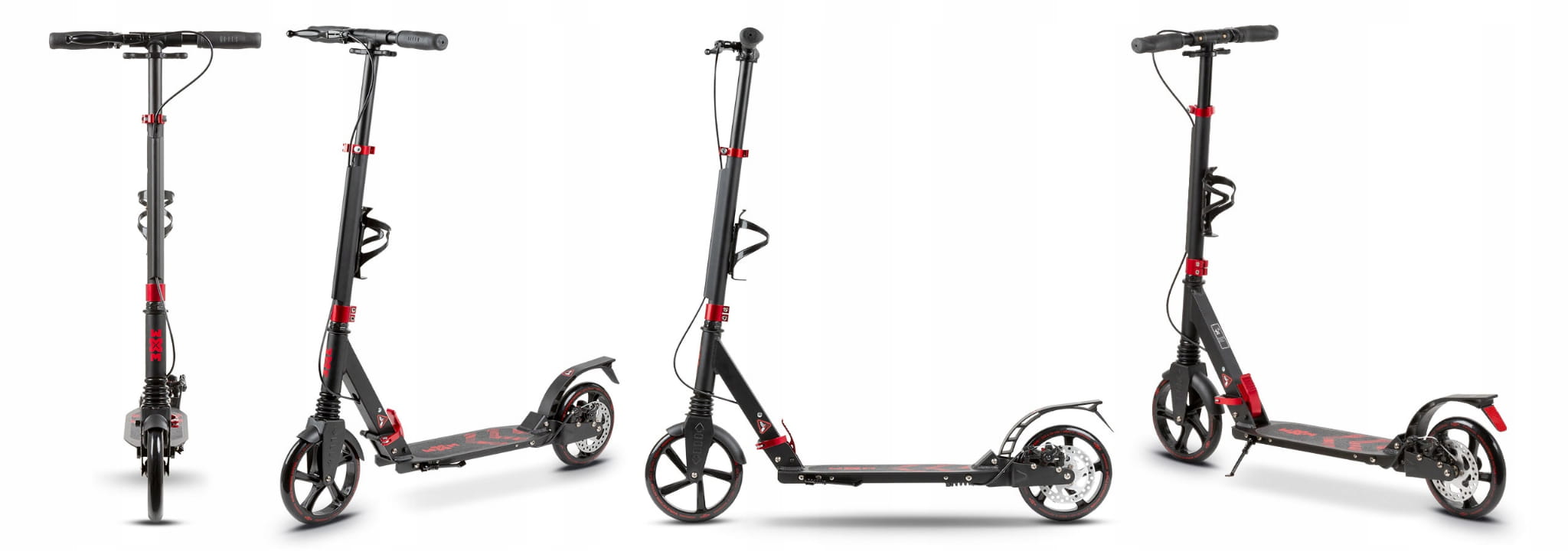 - Materiały: Deck, Zaciski, Kierownica, Hamulec nożny: Aluminium; Widelce, Hamulec tarczowy, Drążek kierownicy: Stal; Koła: PU