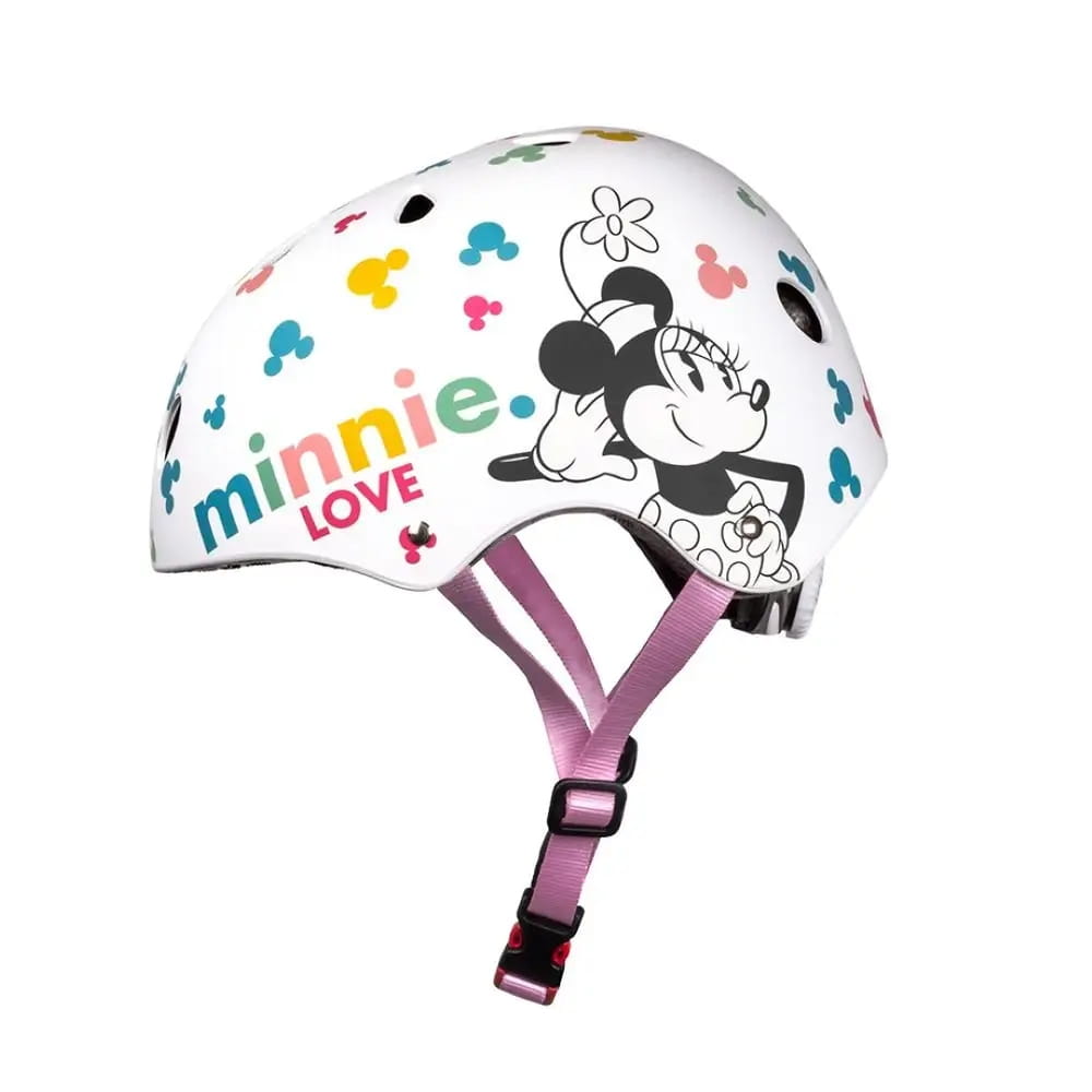Kask ozdobiono kolorowymi wzorami przedstawiającymi ulubionych bohaterów bajek Disney'a - Myszkę Minnie i Myszkę Mickey.